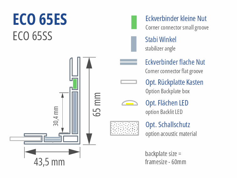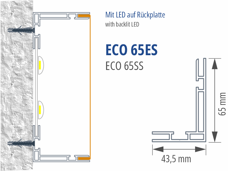 Das Eco 65es ist ein einseitiges Slim-Lightbox Profil mit 65mm Bautiefe für Innenbereiche mit mittleren bis größeren Formaten. Montage über untere und seitliche Leisten mit eigener Montagenut, dann Platte einstellen und obere Leiste aufsetzen. Höhere Stabilität als das Eco 50es durch verstärkte Profilgeometrie.