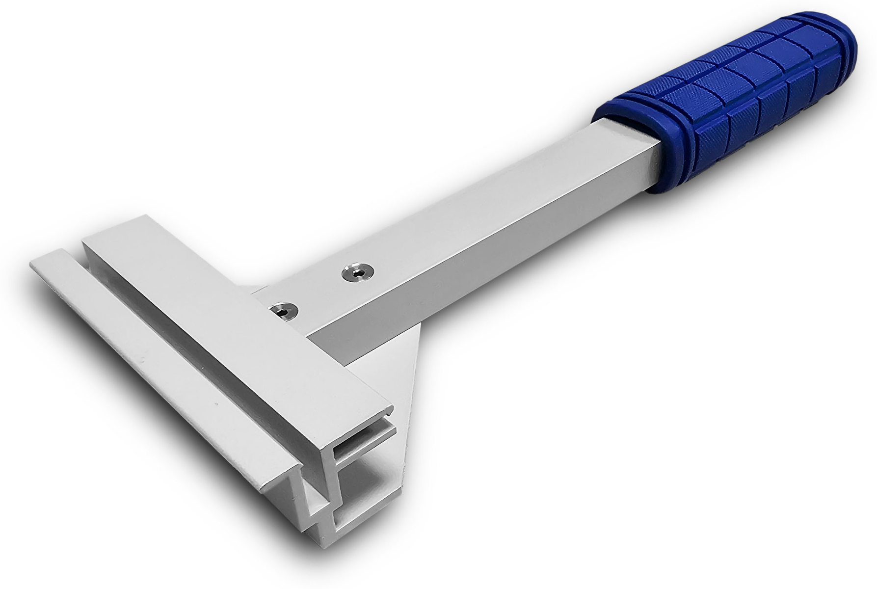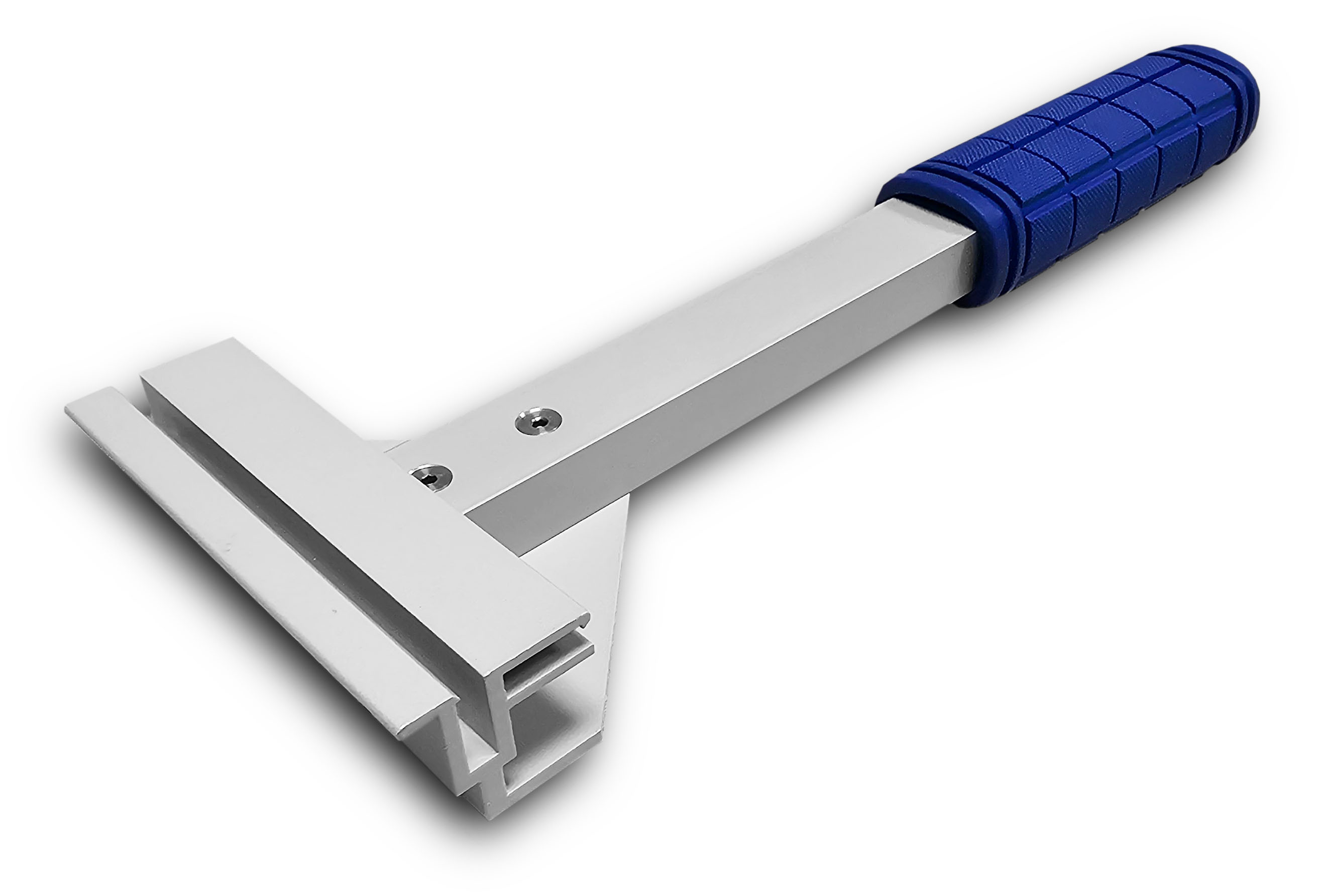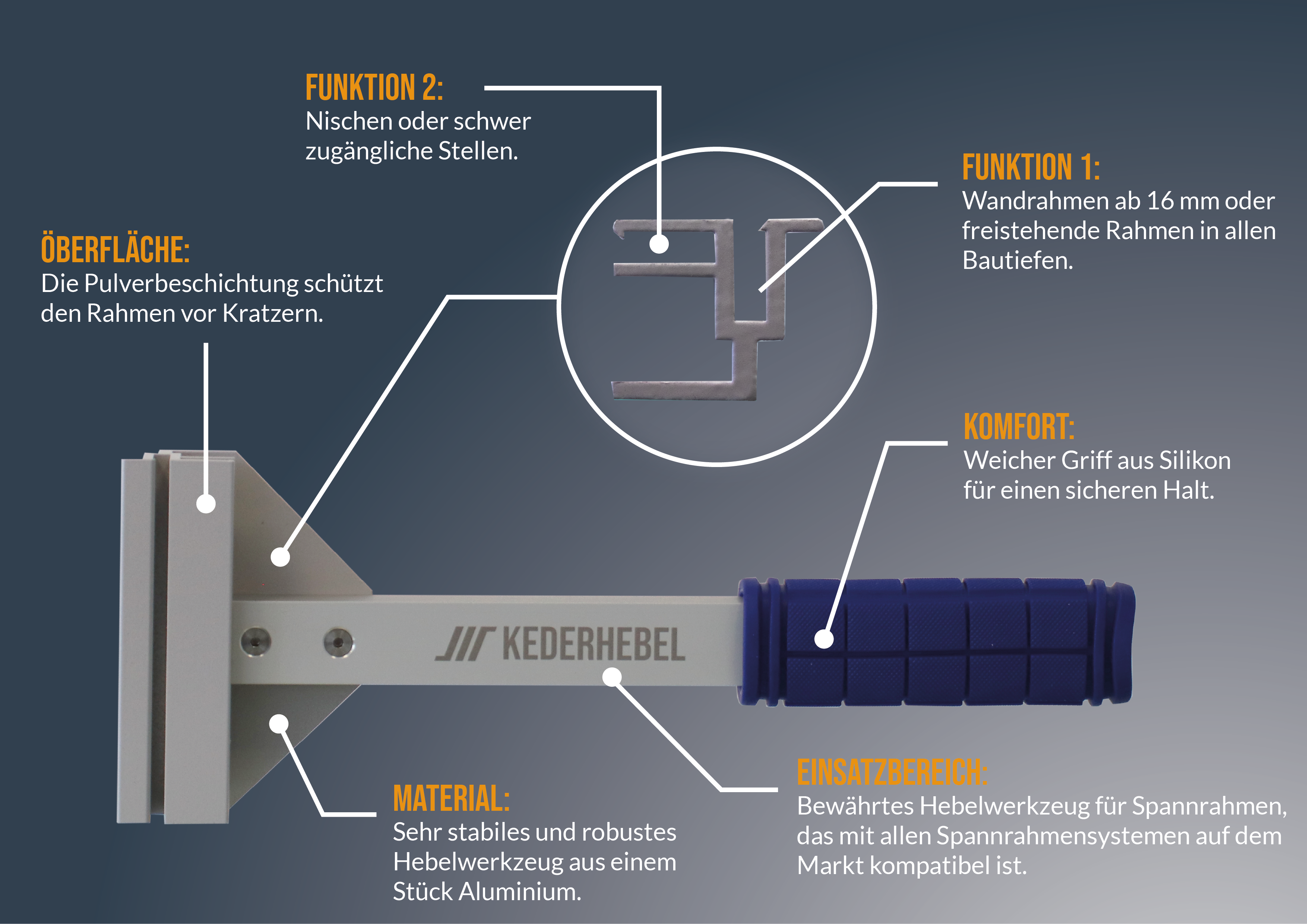 The Keder lever is a tool that allows tensioning fabrics that are too small to be fitted to be pressed into the frame. To do this, simply press the rubber lip of the tensioning fabric into the groove of the tool and position it against the outside of the frame. Press the lever towards the wall to push the rubber lip into the frame.