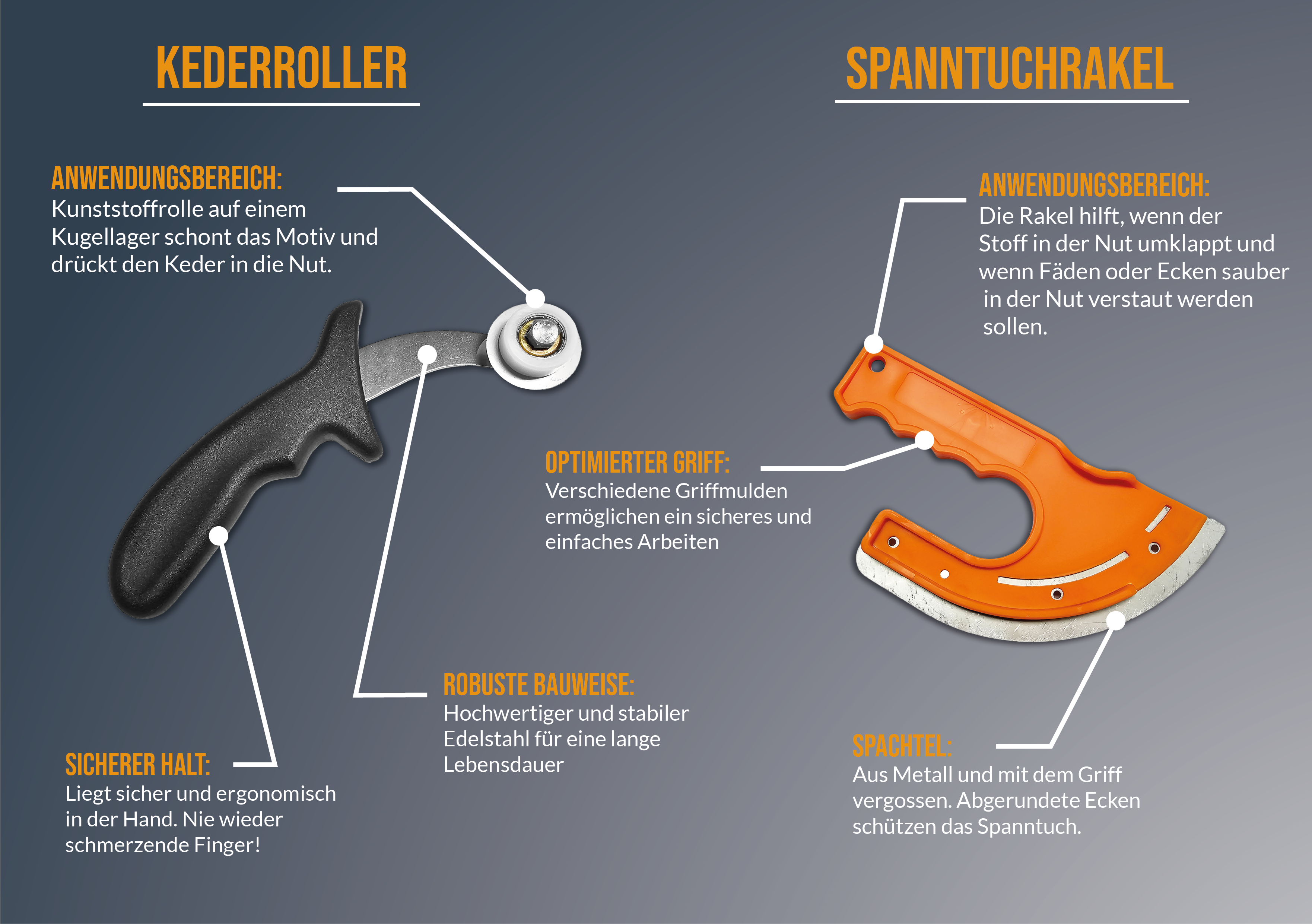 Mit dem Kederroller können korrekt konfektionierte Spanntücher sehr schnell in den Rahmen eingebracht werden. Tuch und Finger werden geschont.