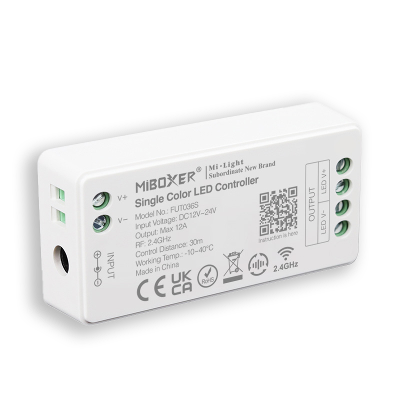 12V-24V Dimmer für Lichtanwendungen. Max. Output 12A. Der Controller erzeugt das Steuersignal für Led Module oder Stripes.