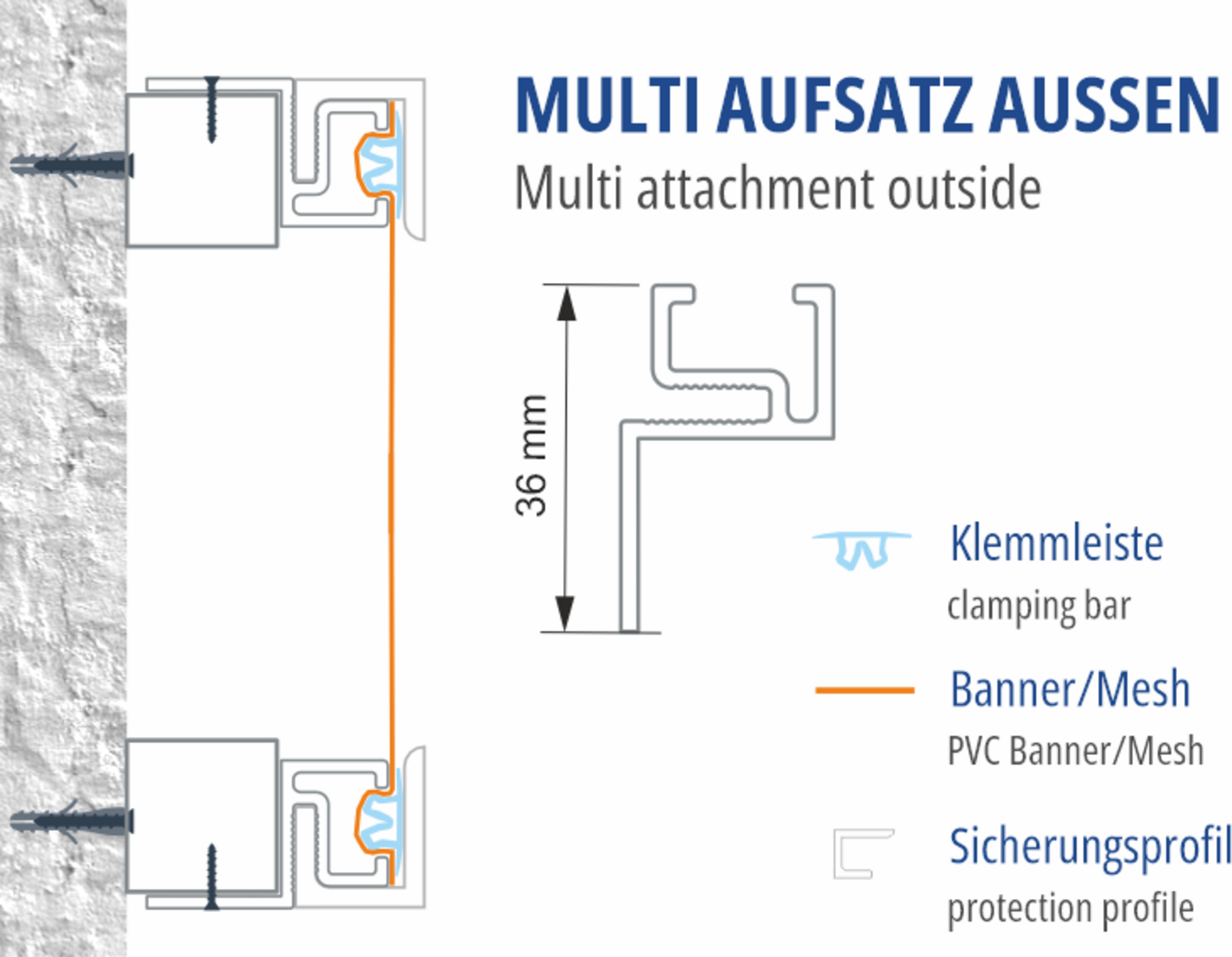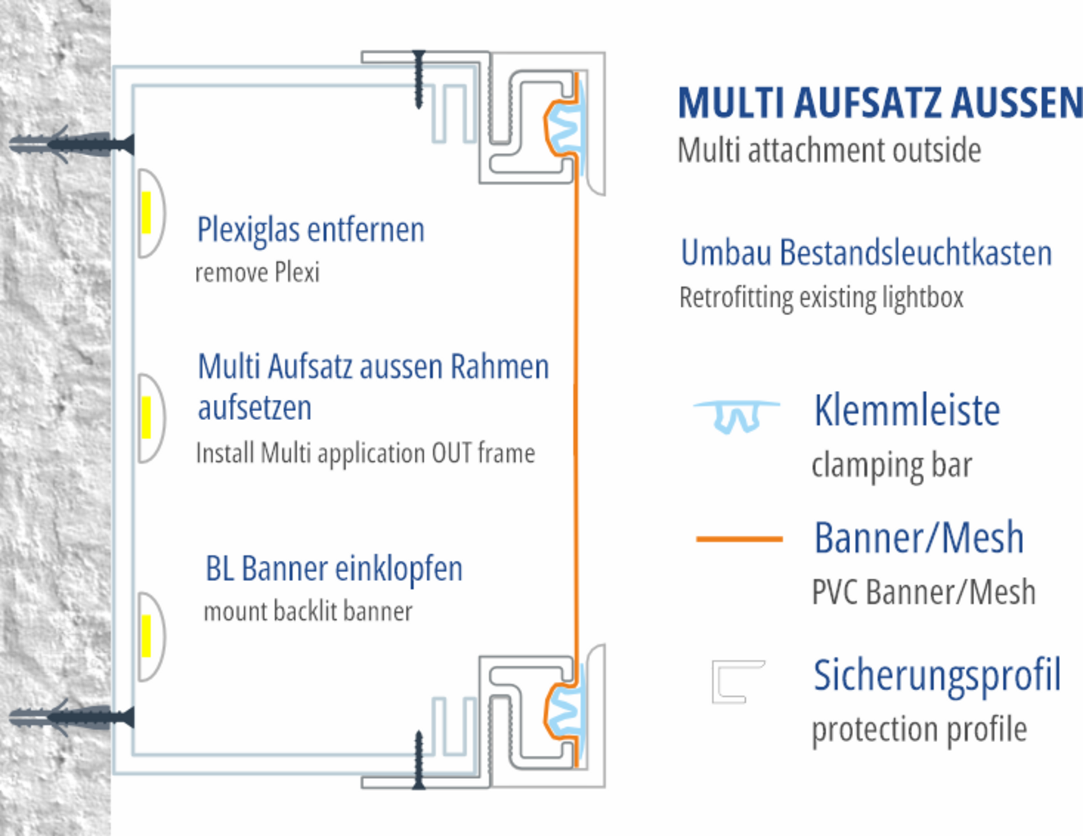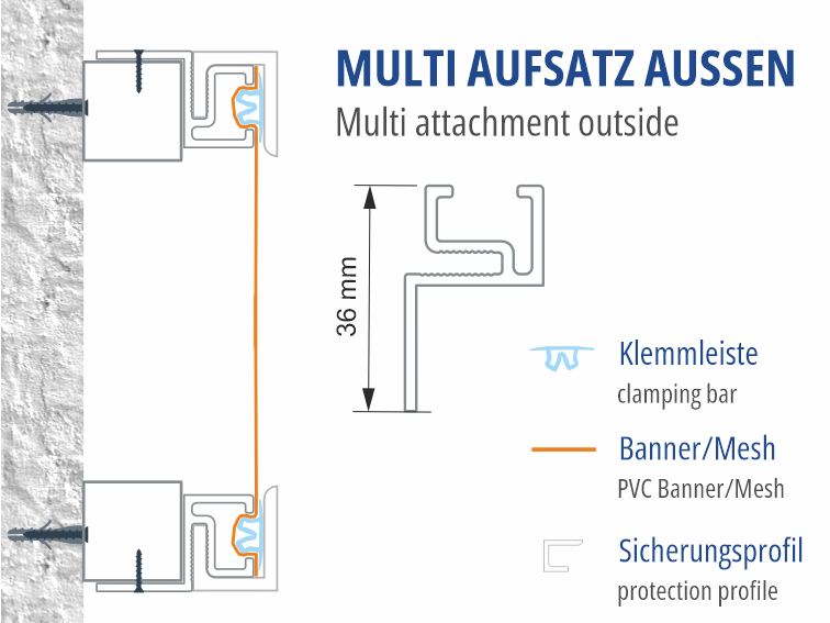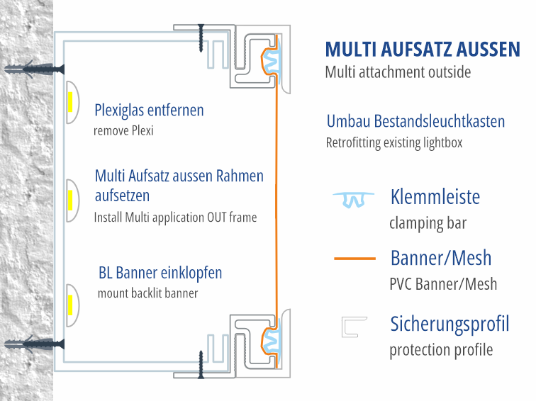 Unsere bewährte Schlagtechnik zum Aufsetzen auf bestehende Leuchtkästen, Unterkonstruktionen oder Standardprofile. Machen Sie aus einem bestehenden Plexileuchtkasten einen Spanntuchkasten. Setzen Sie dieses Profil aussen auf Unterkonstruktionen auf, und verwandeln Sie damit die Fläche in ein Spannsystem ohne Konfektionierung des Spanntuches. Bauen Sie Ihr eigenes Leuchtkastenprofil mit Standardprofilen und diesem Aufsatz, usw.....