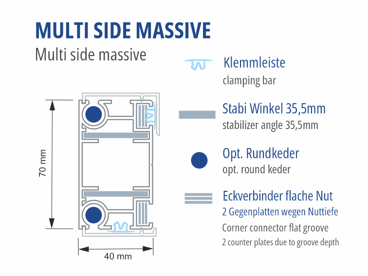 Noch massivere Ausführung als das klassische Multi side. Eine Vertiefung im Querschnitt sorgt auch für eine einfachere Montage (die Schraubenköfe verschwinden auch ohne größer vorbohren zu müssen unter dem Tuchniveau)Vereint Schlagtechnik und Rundkeder zu einem Profil.Zur einfacheren Montage kann das Banner mit dem Rundkkeder oben eingefädelt und seitlich mittels Klemmleiste fixiert werden.Als Sicherungsprofil sind 2 Varianten verfügbar.Multi Side massiv Cover small - nahezu Rahmenlos sowieMulti Side massiv Cover large - bildet den optisch und technisch perfekten Abschluss Ihres Spannrahme