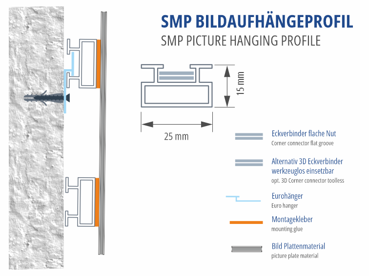 Günstiger als die häufig eingesetzten U-Profile wird dieses Profil an der Rückseite von Bildtafeln verklebt. Eckverbinder und Aufhängehaken hinterlassen bei Ihren Kunden einen professionellen Eindruck!