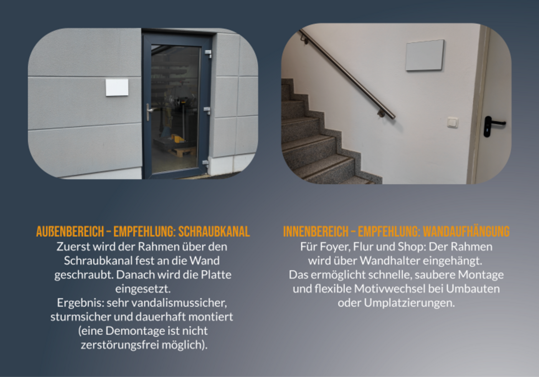 Die Platten werden sauber im Rahmen eingefasst. Das Profil kann zusätzlich verstrebt werden. Es gibt zwei Klebeflächen für 1,5cm breites doppelseitges Klebeband. Für große Anwendung kann die Platte auch auf den Streben verklebt werden.