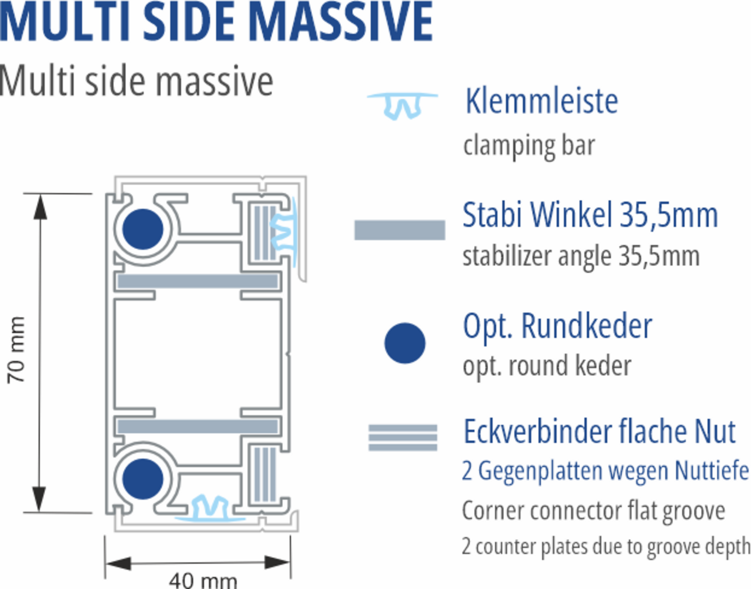 Combines snap-in technology and round keder in one profile. For easier installation, the banner can be threaded in from the top using the round keder and secured on the sides using a clamping bar. A recess in the cross-section further simplifies installation – the screw heads disappear below the fabric level without extensive pre-drilling. Two variants are available as retaining profiles: Multi Side solid Cover small – almost frameless – and Multi Side solid Cover large – providing the visually and technically perfect finish for your tensioning frame.