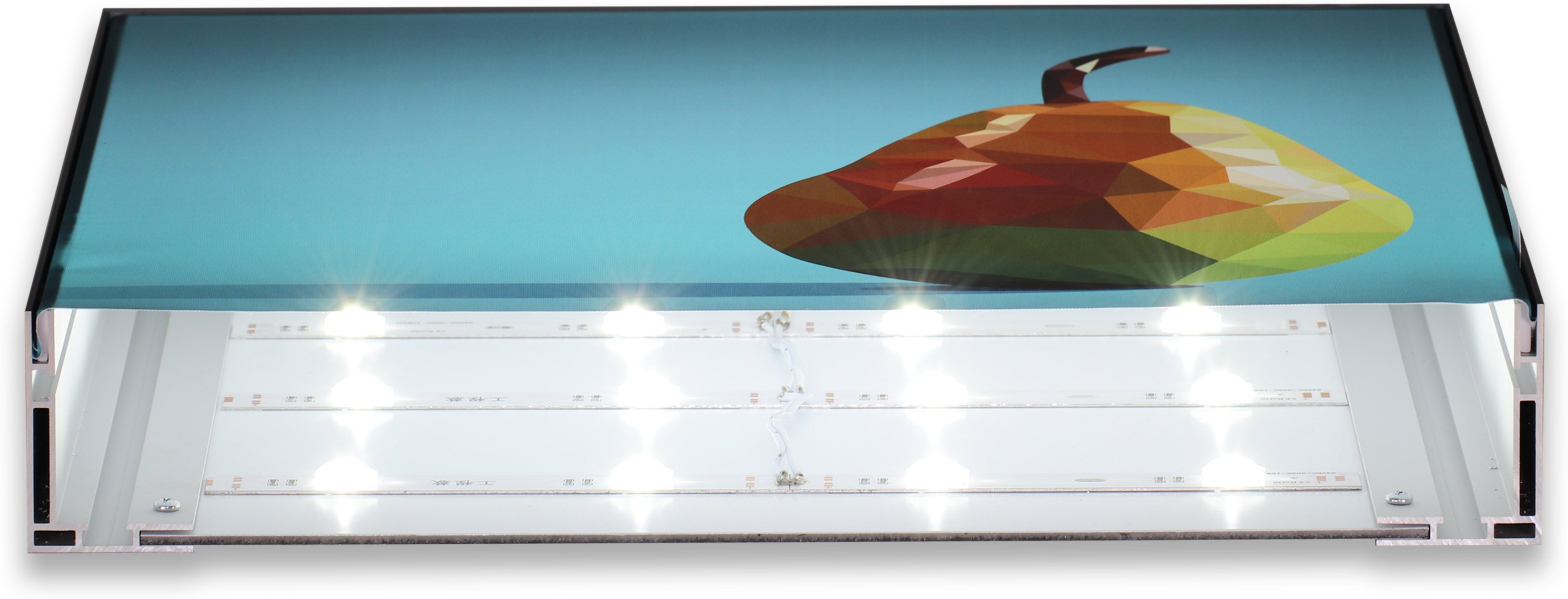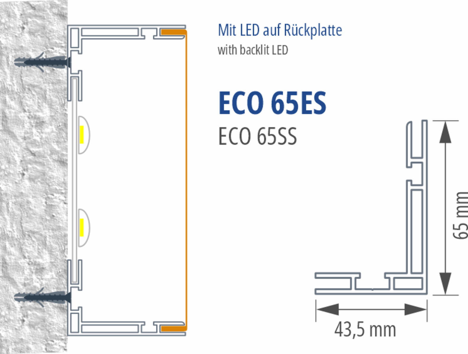 Das Eco 65es ist ein einseitiges Slim-Lightbox Profil mit 65mm Bautiefe für Innenbereiche mit mittleren bis größeren Formaten. Montage über untere und seitliche Leisten mit eigener Montagenut, dann Platte einstellen und obere Leiste aufsetzen. Höhere Stabilität als das Eco 50es durch verstärkte Profilgeometrie.