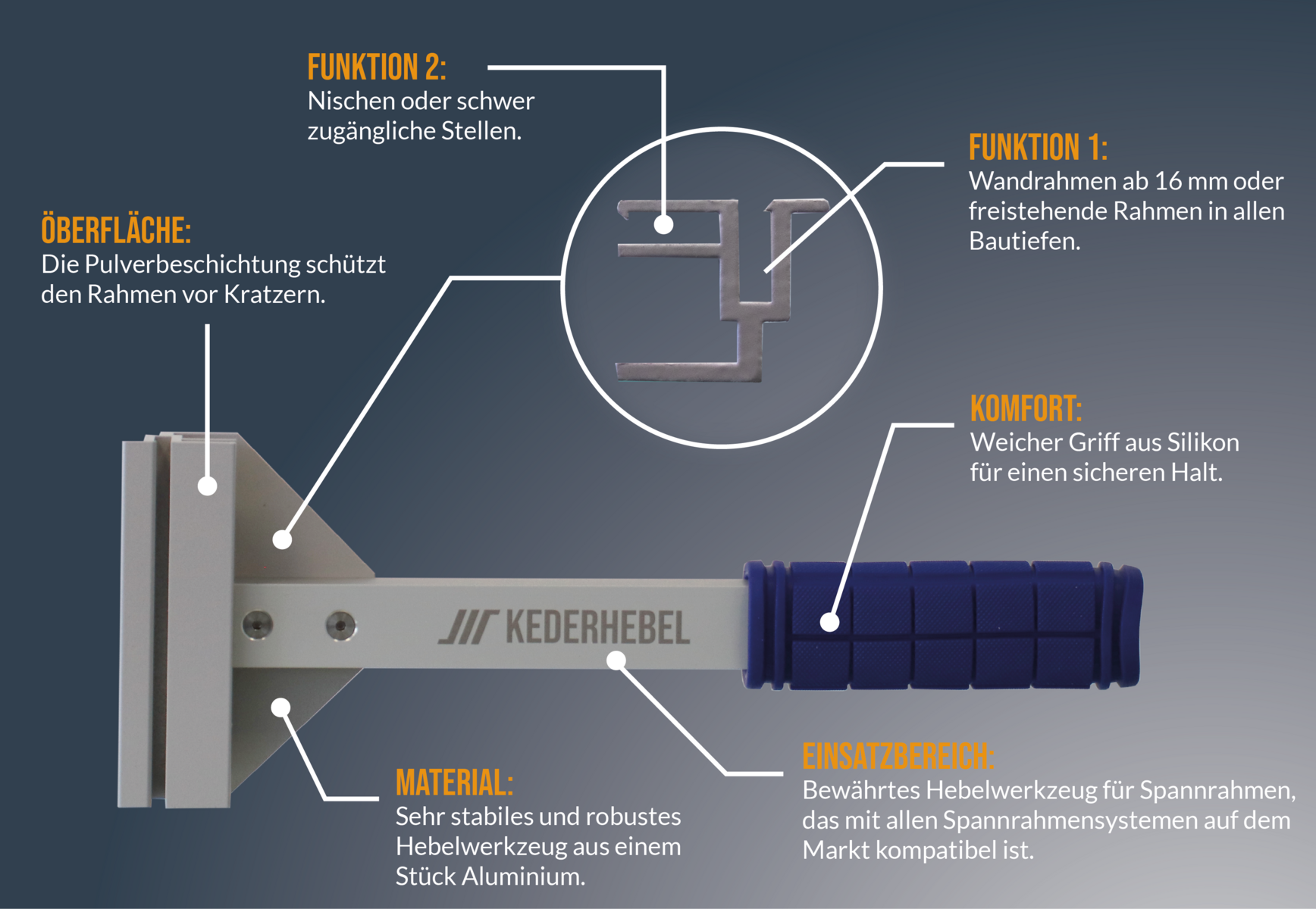 The Keder lever is a tool that allows tensioning fabrics that are too small to be fitted to be pressed into the frame. To do this, simply press the rubber lip of the tensioning fabric into the groove of the tool and position it against the outside of the frame. Press the lever towards the wall to push the rubber lip into the frame.
