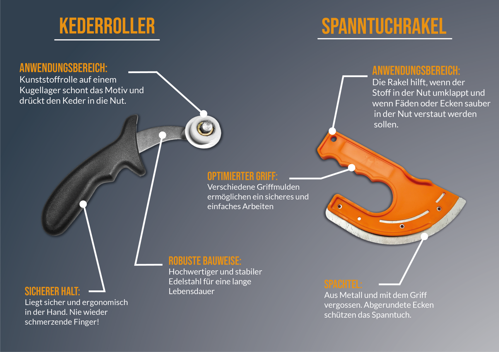 Mit dem Kederroller können korrekt konfektionierte Spanntücher sehr schnell in den Rahmen eingebracht werden. Tuch und Finger werden geschont.