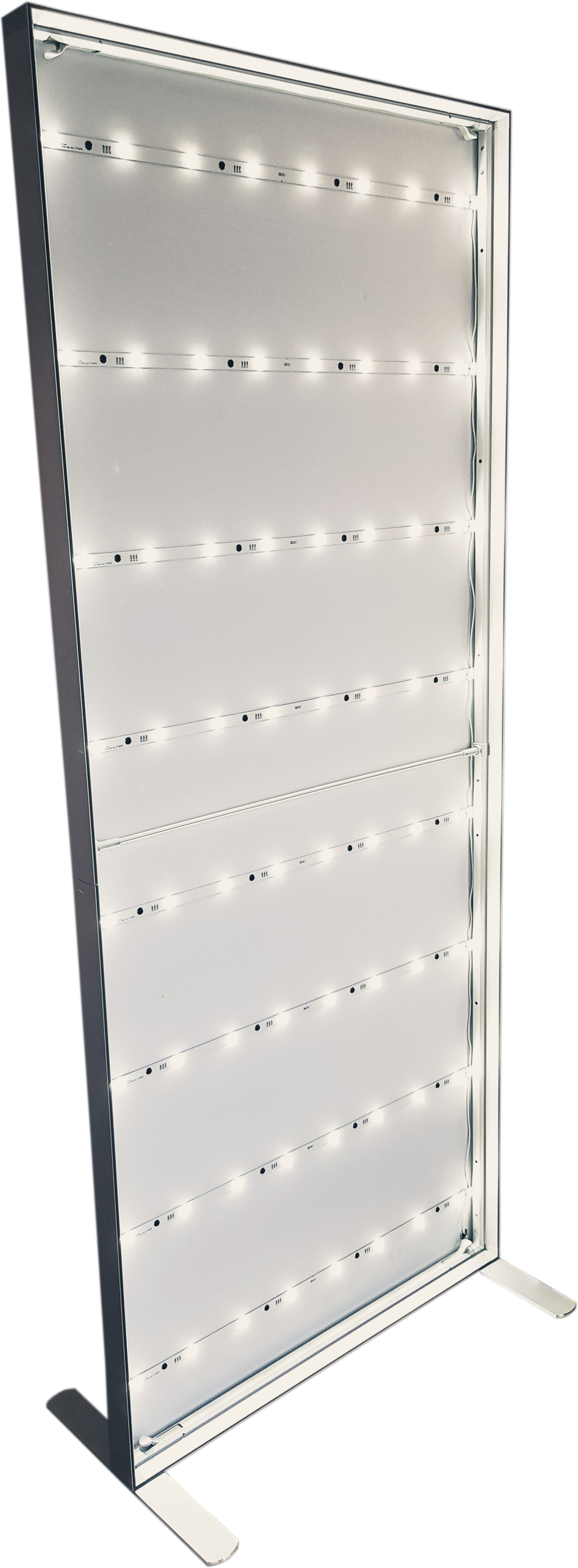 Unser neuester, schlanker und sehr günstiger aus der Fläche beleuchteter 85x200cm Aufsteller!!! Auf einem Blockout-Spanntuch sind die Flächenplatinen fix montiert. Die Rückseite kann durch eine doppelte Flachbandnut trotzdem unbeleuchtet gebrandet werden.