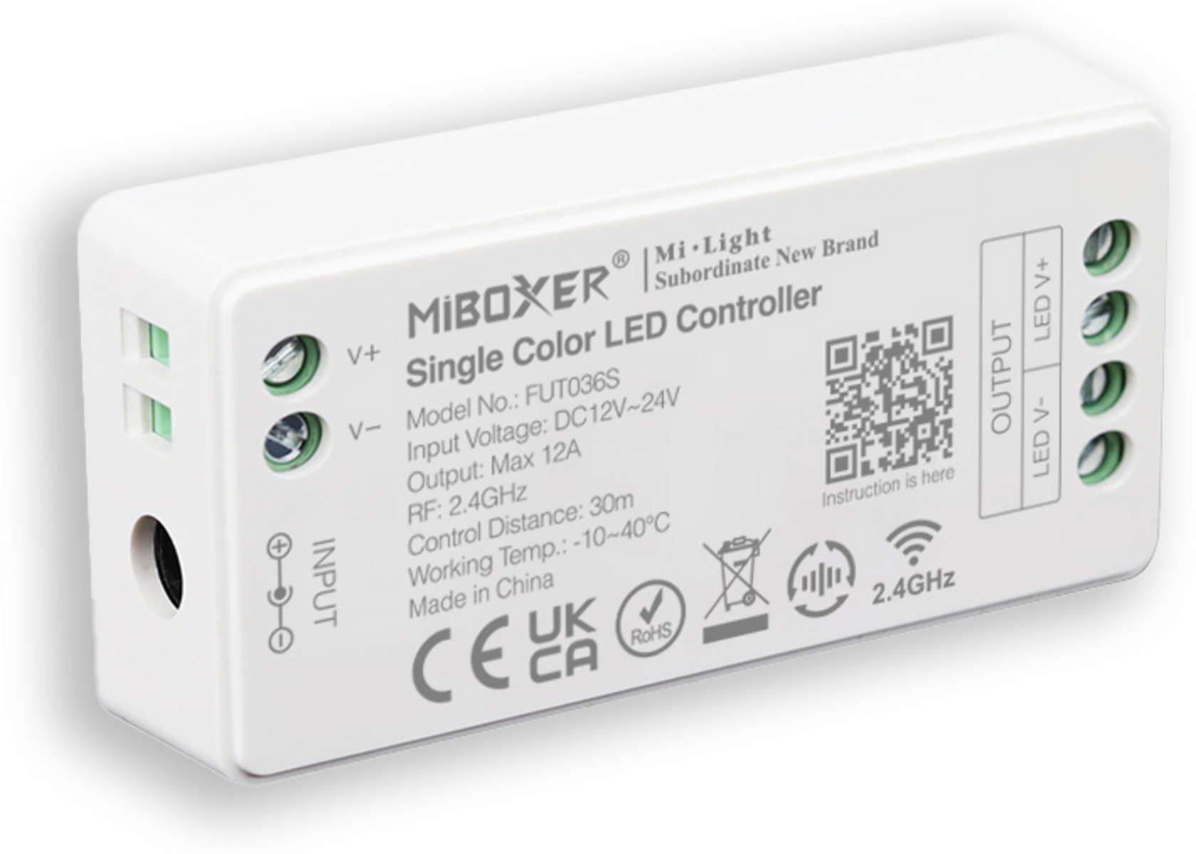 12V-24V Dimmer für Lichtanwendungen. Max. Output 12A. Der Controller erzeugt das Steuersignal für Led Module oder Stripes.
