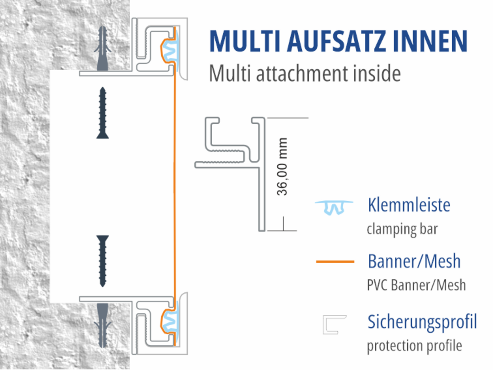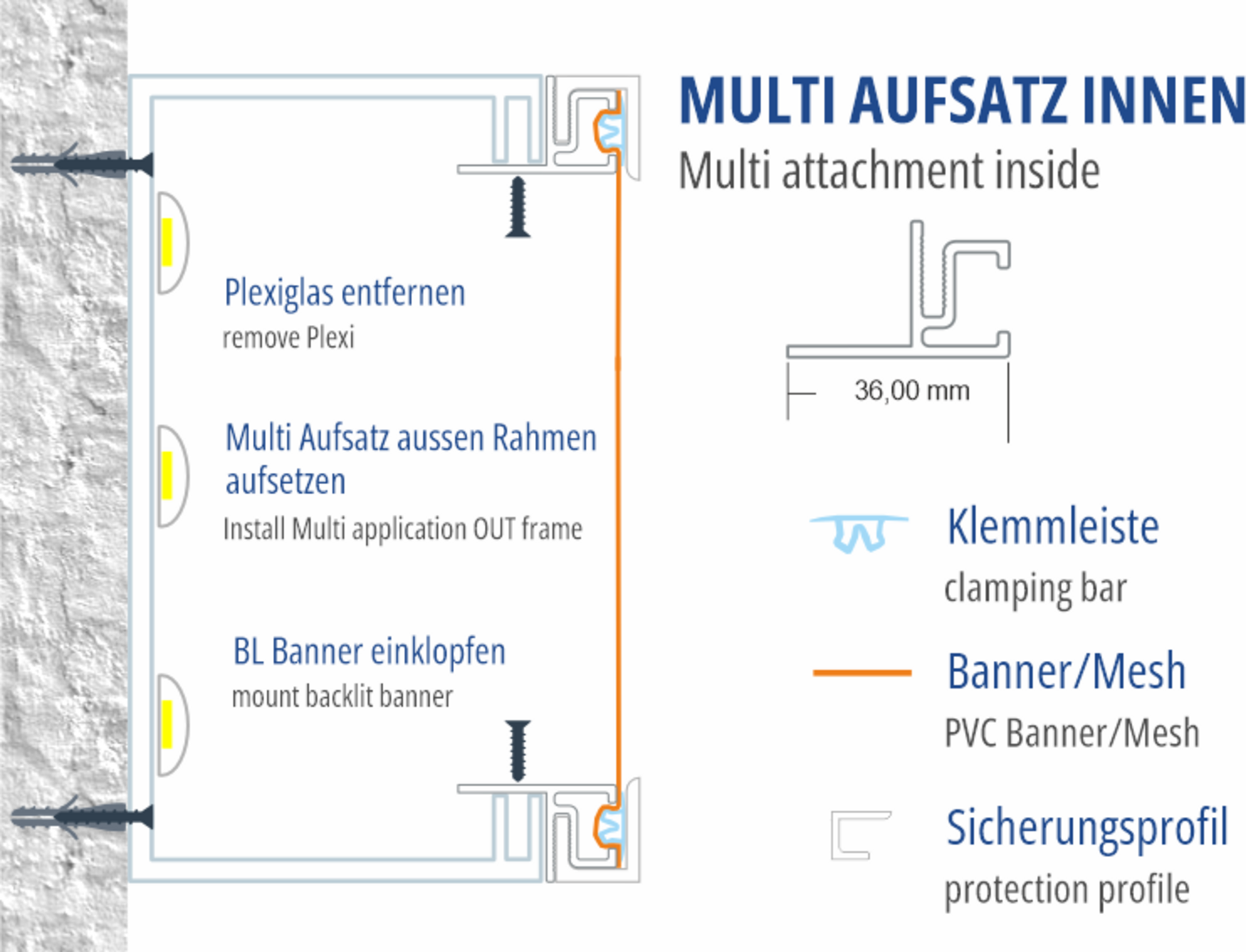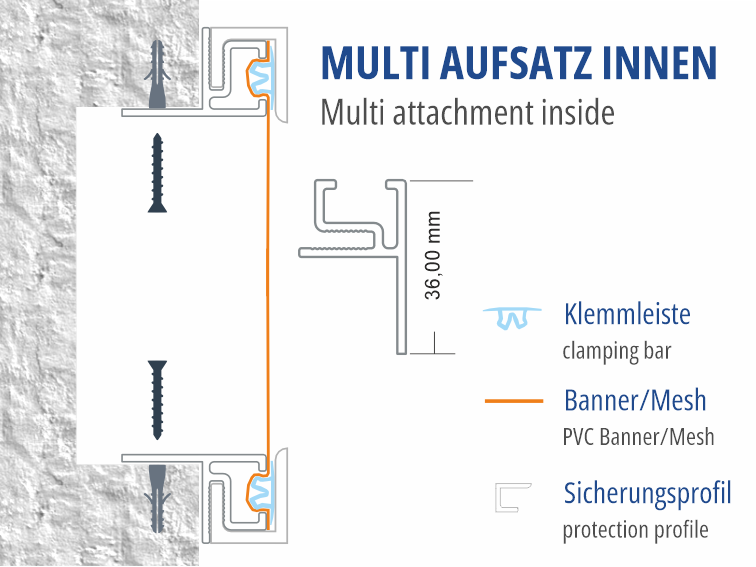 Our proven impact mounting technique for attaching to existing lightboxes, substructures, or standard profiles. Transform an existing plexiglass lightbox into a tension fabric lightbox. Install this profile internally on the substructures and convert the surface into a tension system without fabric finishing. Build your own lightbox profile with standard profiles and this attachment. etc...