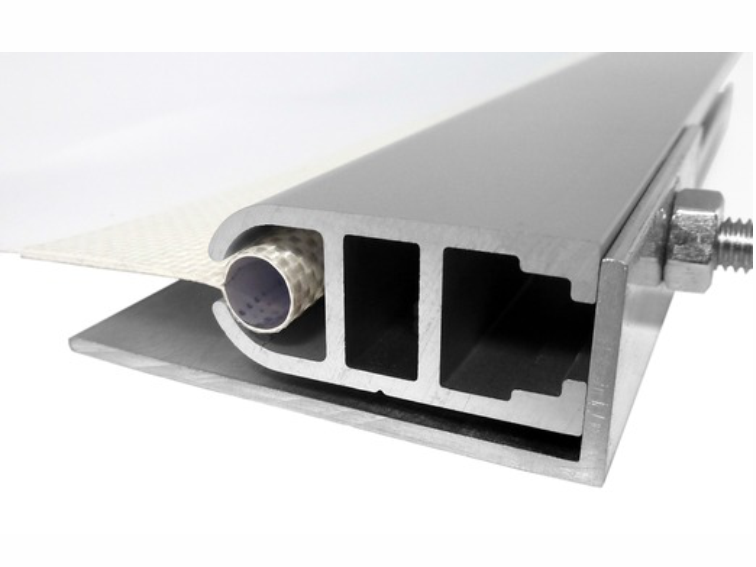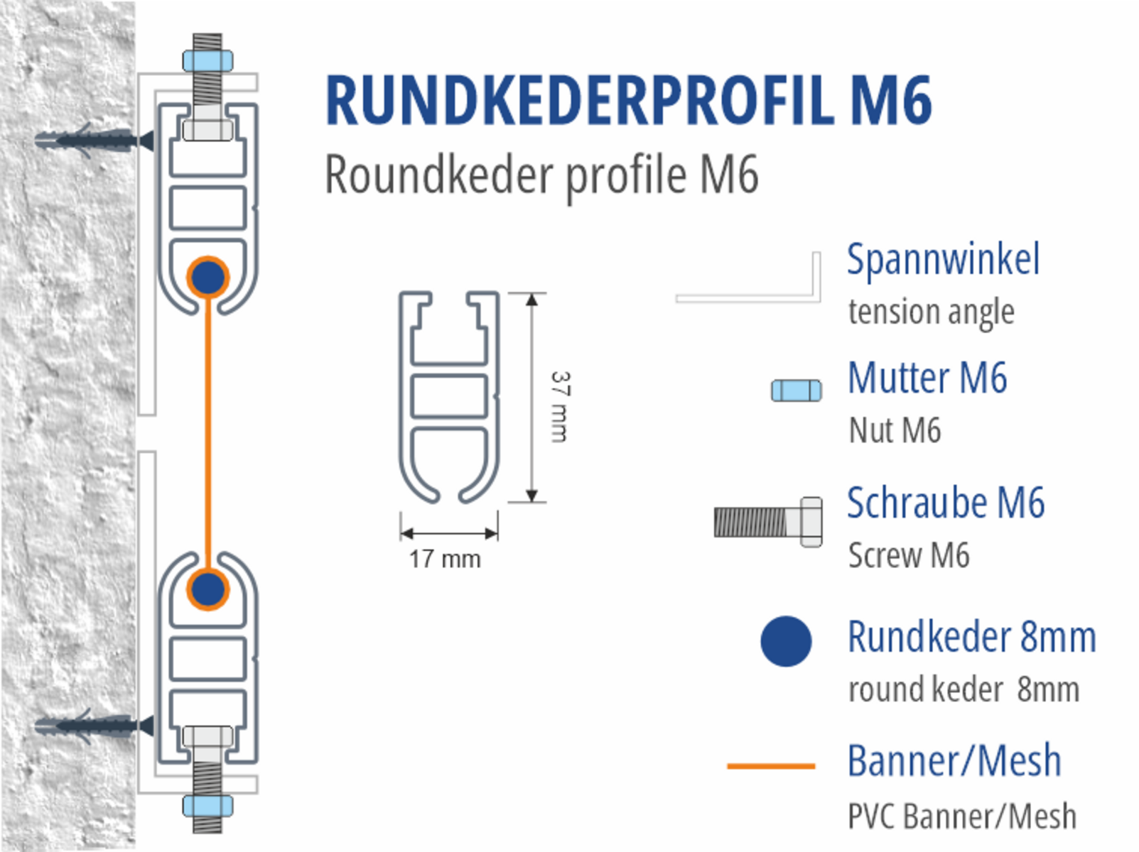 Auf einer Seite das gekederte Spanntuch, auf der anderen Seite eine Standard M6 Maschinenschraube.