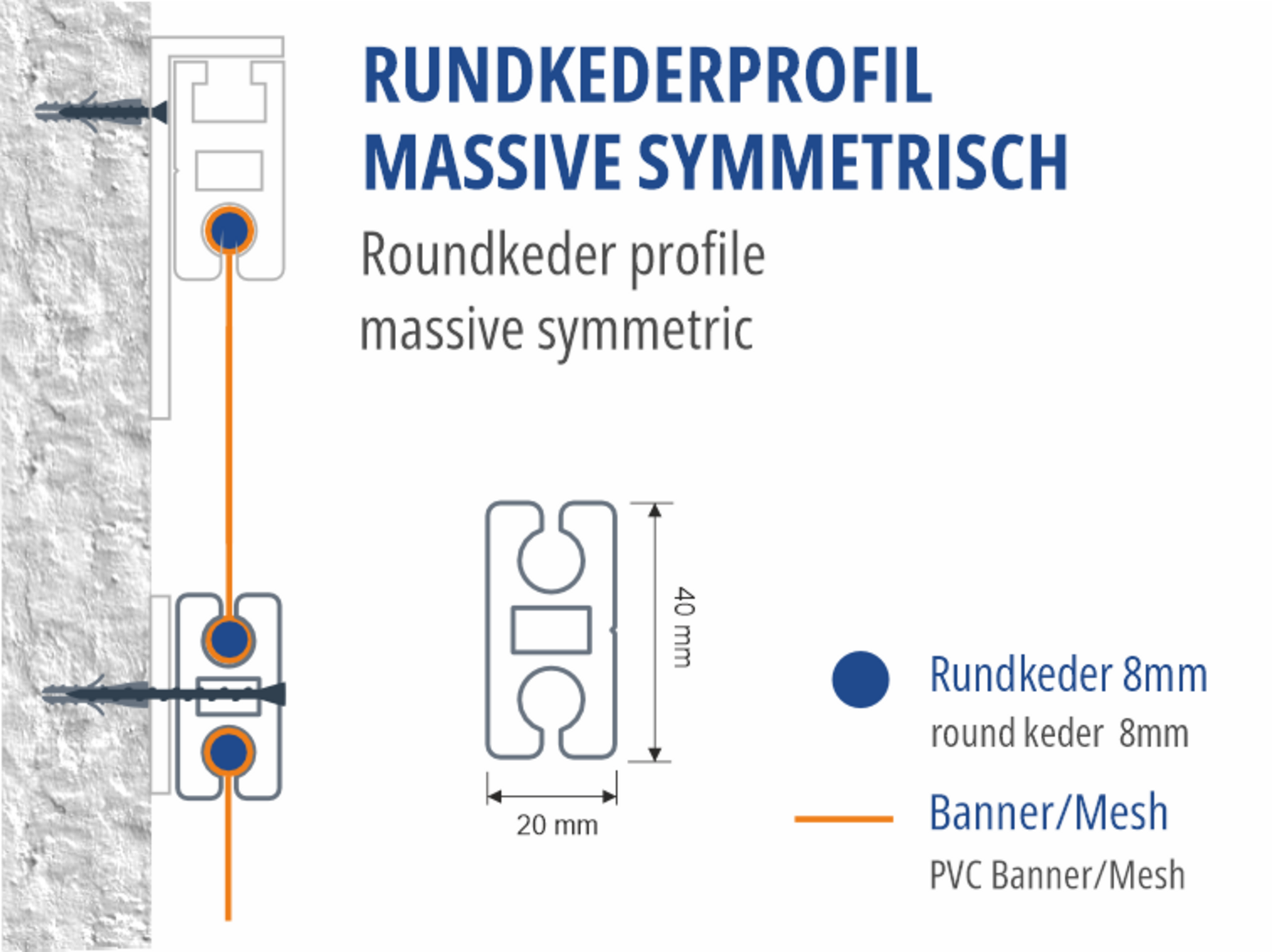 Ein besonders massives Rundkederprofil mit doppelter Kederaufnahme. Zur Unterteilung von großen Installationen im Außenbereich.