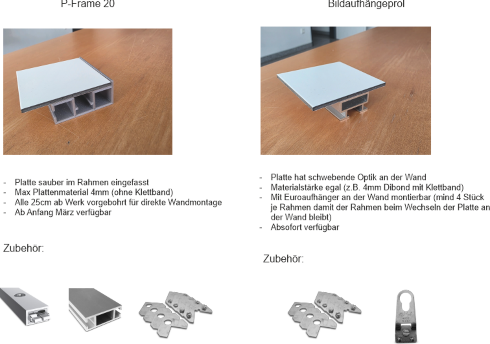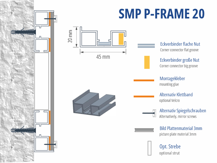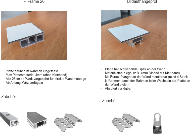 Die Platten werden sauber im Rahmen eingefasst. Das Profil kann zusätzlich verstrebt werden. Es gibt zwei Klebeflächen für 1,5cm breites doppelseitges Klebeband. Für große Anwendung kann die Platte auch auf den Streben verklebt werden.